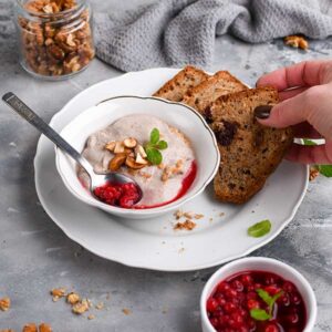 Pierś z kurczaka w sosie brokułowym z dodatkiem koperku, musztardy i parmezanu; ryż, surówka porowa